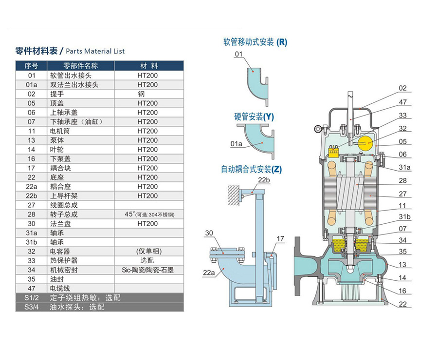 80QW65-25-7.5潛水排污泵為保證污物的順利通過,必須加大葉輪過流面寬度,對于大泵,可采用雙葉片、三葉片式;對于小泵,則采用單(雙)流道形式,它類似于一截面大小相同的彎管,又非常好的過流特性。避免了水流在低速情況下可能造成的堵塞、纏繞。這種獨特設計的葉輪流道,配合合理的蝸室,使污水中的紙、紡織物、垃圾袋及其它物料能自由通過。葉輪經過動、靜平衡,使泵在空載試運轉和帶負荷過程中均不產生振動。該產品機泵同軸,結構緊湊,效率高,安裝維護方便,運行經濟,適應性強,其安裝方式有移動式安裝和固定式安裝,固定式安裝又分為自動耦合安裝與固定干式安裝,移動式安裝又叫自由式安裝。